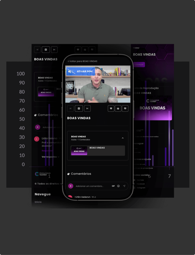 Você tem acesso a aulas ao vivo e gravadas, diversos cursos voltados para a prática da profissão, e acesso à comunidade exclusiva de alunos para trocar experiências e fechar parcerias.